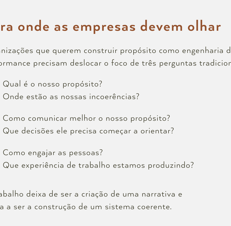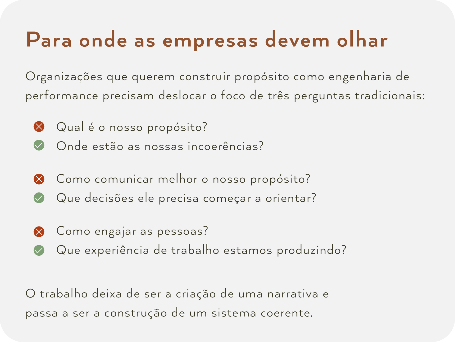 Essa é uma mudança de paradigma importante: propósito deixa de ser um elemento motivacional e passa a ser uma infraestrutura de funcionamento.